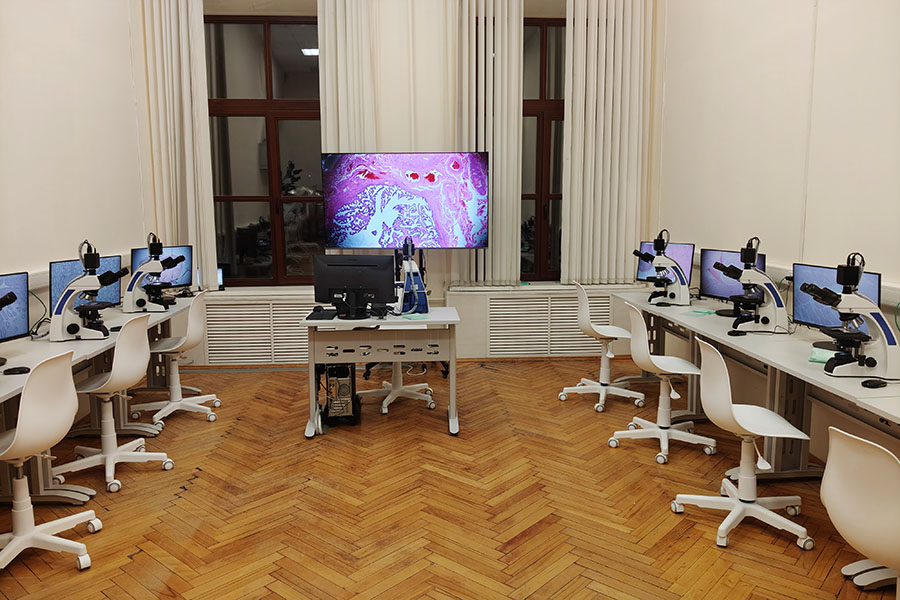 - Класс цифровой микроскопии позволяет работать командой и изучать значительно большее количество микропрепаратов, обсуждать с преподавателем не только свои задания, но и задания других обучающихся.